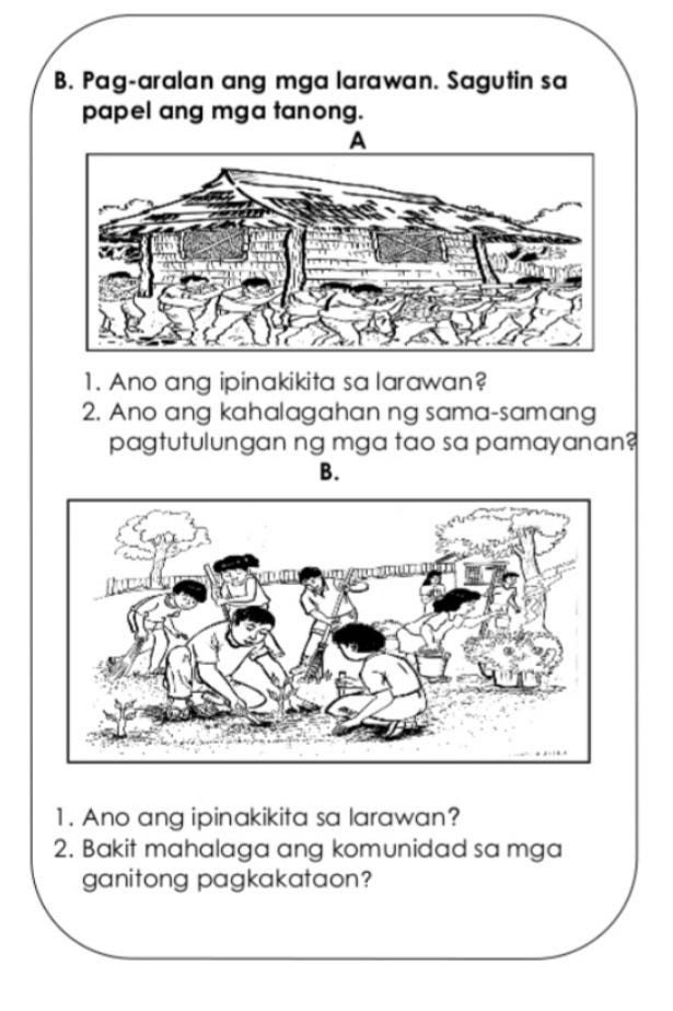 Bagaman mga bata pa mahalaga na ang mga mag-aaral ay mayroon nang nalalaman tungkol sa kanilang kapaligiran. Piliin ang kasagutan sa kahon. Ang mga tao sa isang komunidad ay nagtutulungan para gumanda ang buhay.