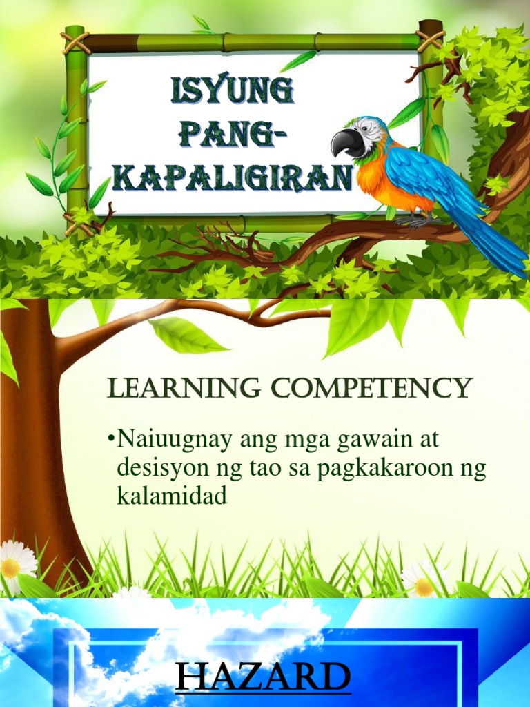 Introductory Part AP10KSP-Id-e-9 -Naiuugnay ang gawain at desisyon ng tao sa pagkakaroon ng kalamidad 3. May masamang epekto sa kalikasan ang paggamit ng maraming tao ng mga enerhiya na hindi likas-kaya sustainable. Maitutukoy ang iba-t-ibang epekto ng kalamidad sa ating bansa.