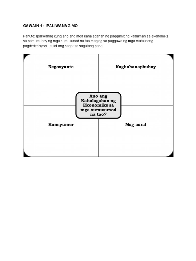 01 Nabibigyang kahulugan ang ekonomiks. Nais nito bigyan ng paliwanag kung paano natin binibigyan ng katumbas na halaga ang isang produkto o serbisyo at kung paano natin binubuo ang mga ating mga pagpapasya kaugnay ng kalakalan. 24-07-2017 Ipagawa sa mag-aaral ang sumusunod.