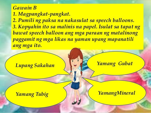 Paano nga ba ang wastong paggamit ng Likas na Yaman. Peña Hulyo 27 1981 Hunyo 30 1984 19 Rodolfo P. Pumili ng paksa na nakasulat sa speech balloons.