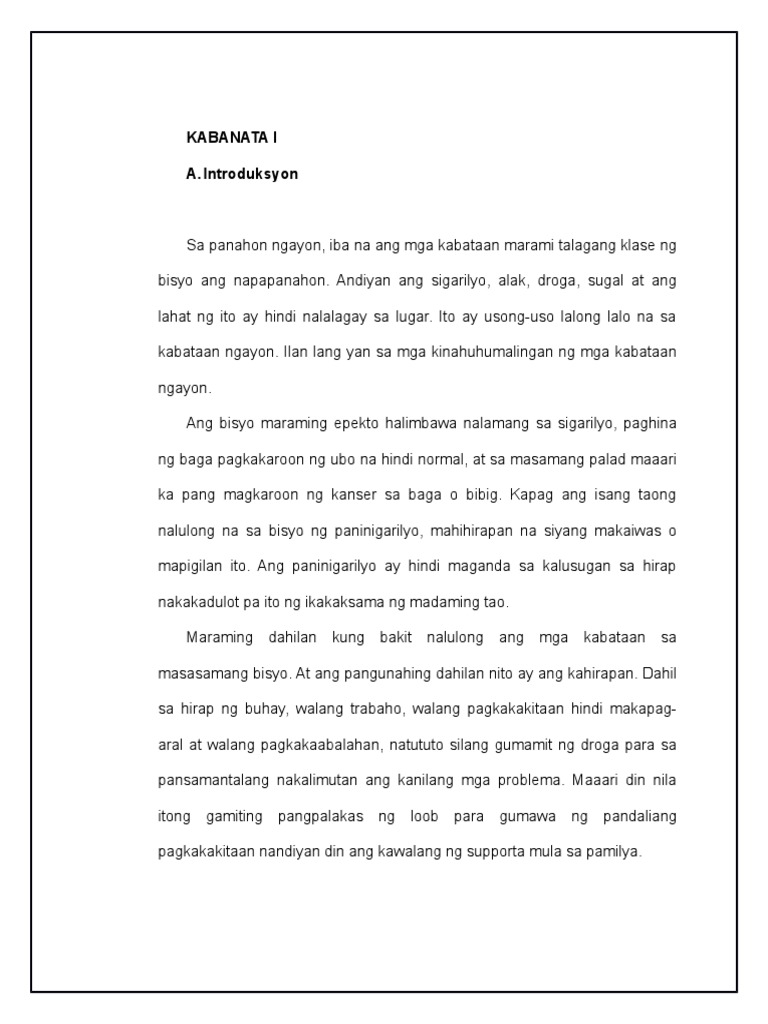 1 Gusto nilang madama na malaki na sila at magpasiya para sa kanilang sarili. Masisisra ang magandang kinabukasan ng pinakamahalagang yaman ng ating bansa ang kabataan. Tulad ng droga tinatawag ngang bawal na gamot ngunit bakit bakit patuloy pa din lumalaganap ang nasabing bawal na ito.