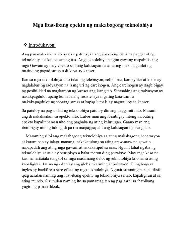 Kung saan sa halip ay maging pag-asa ng bayan ay sila namang nagiging biktima ng maling paggamit ng makabagong teknolohiya. Panimula Tungkulin ng mga kabataan ang mag-aral. Mabuti at di mabuti epekto ng makabagong teknolohiya sa mga kabataan Ang makabagong teknoo0hiya ay tumutukoy sa makabagong paraan upang mas mabilis na paroseso o magawa ang isang bagay na mahirap gawain.