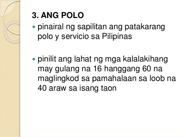 Ang kababaihan sa Pilipinas maging ang kabilang sa pinakamataas na uri o timawa ay pagmamay-ari ng mga lalaki. Kung gusto mong matutunan ang history ng Pilipinas narito ang ilan sa mahahalagang pangyayari na dapat mong malaman. Ang mga lalaking Pilipino na mula 16 hanggang 60 na taong gulang ay pinaglilingkod o pinatatrabaho nanng 40 na araw sa loob ng isang taon sa pamahalaan ng.
