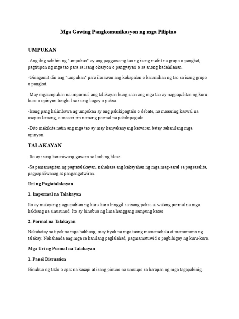 Bawat kulay ay pagkakakilanlan kung anong lahi nagmula ang isang tao. Sa pagtatapos ng araling ito ikaw ay inaasahang makapaglalarawan ng mga gawaing pangkomunikasyon ng mga Pilipino sa ibat ibang antas at larangan at makagagamit ng wikang Filipino sa ibat ibang tiyak na sitwasyong pangkomunikasyon sa lipunang Pilipino. Umpukan Ito ay ang paggawa ng tao ng isang maliit na grupo o pangkat pagtitipon ng mga tao para sa isang okasyon o pangyayari o sa anong kadahilanan.
